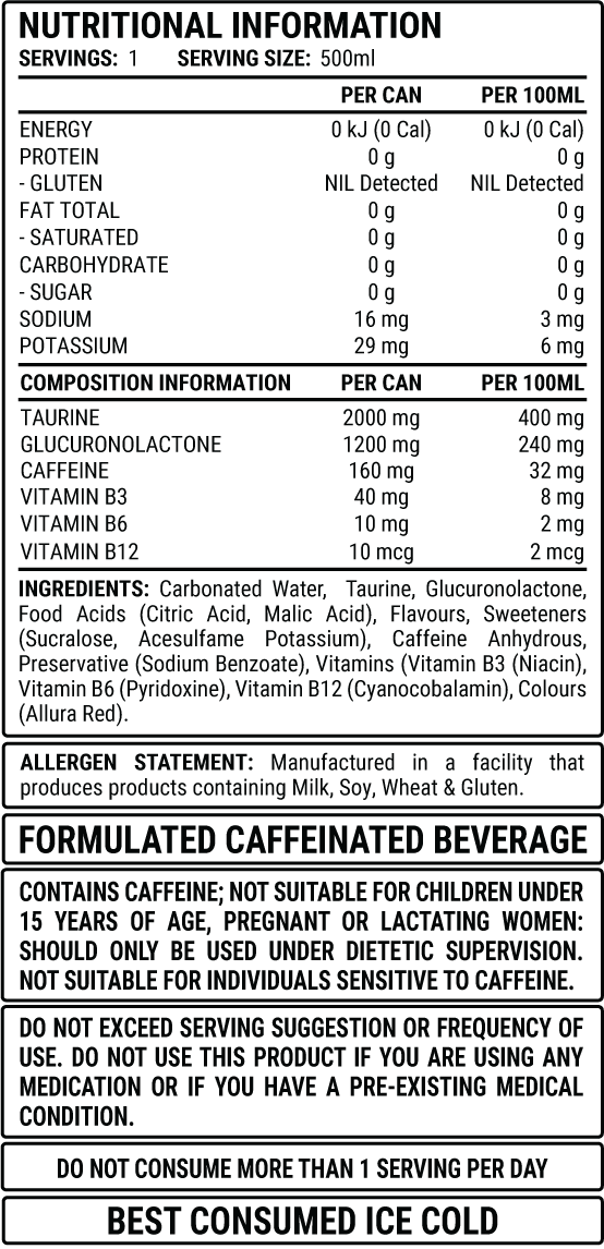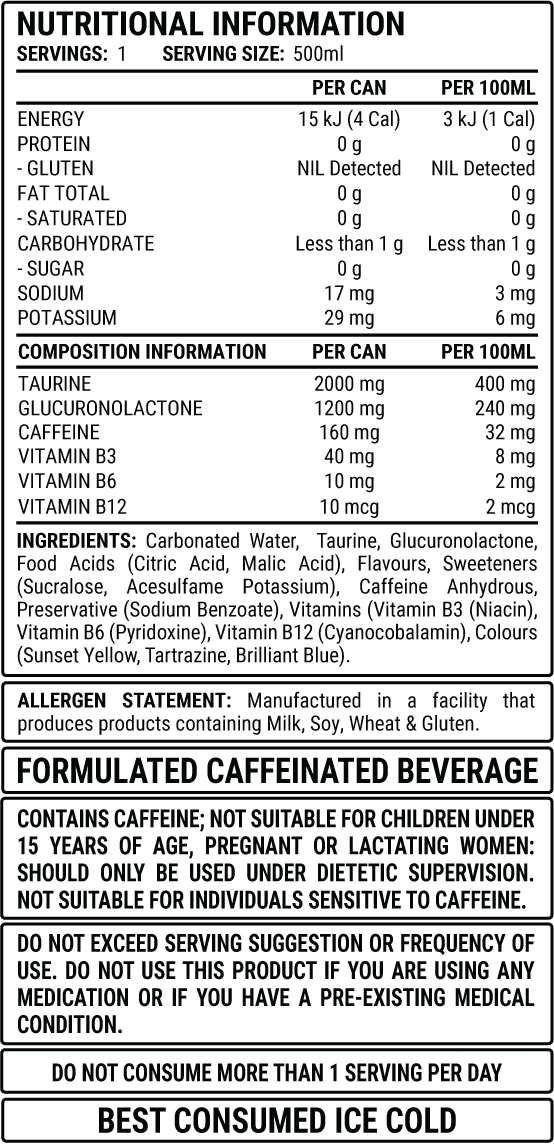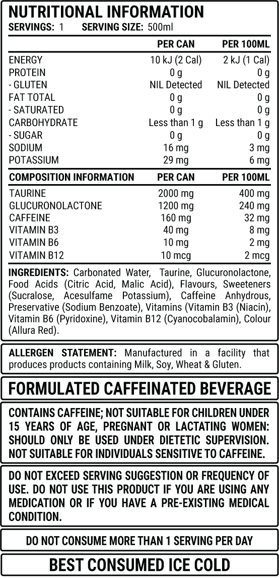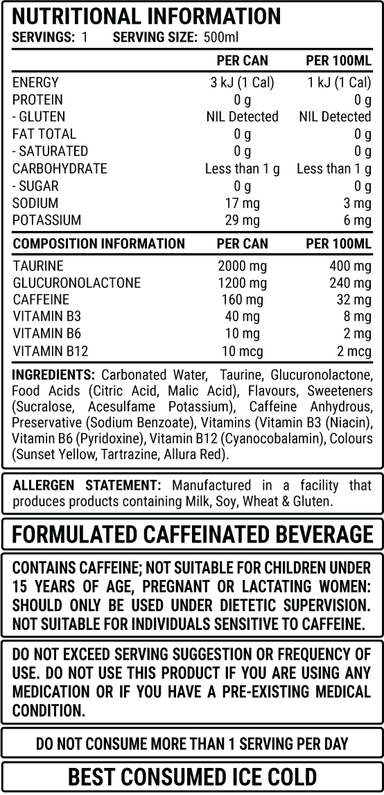 contains 160mg of Caffeine, added Taurine, Glucuronolactone